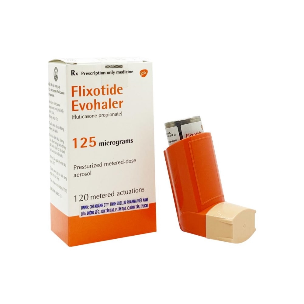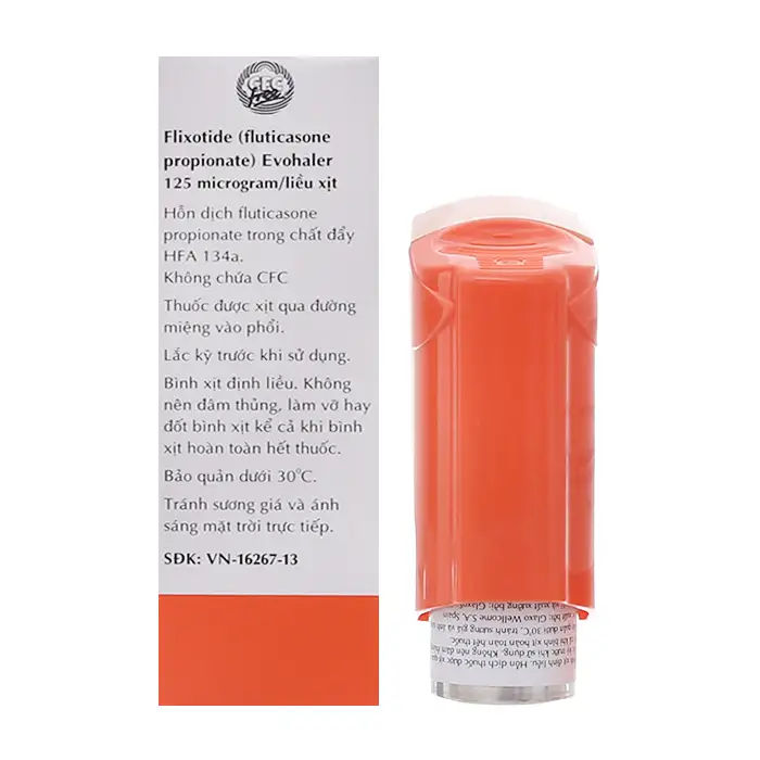 Hoạt chất: Flixotide Evohaler 125mcg là bình xịt định liều điều áp, mỗi liều xịt cung cấp 125mcg fluticason propionat, dụng cụ xịt được thiết kế đặc biệt để xịt vào miệng.