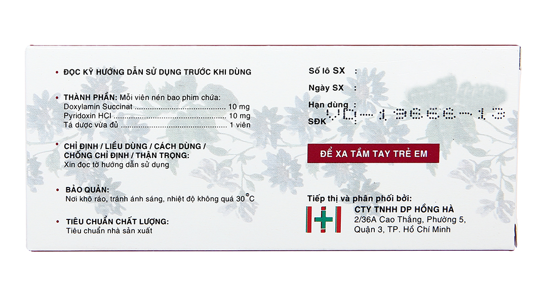 Hai viên nén bao phim (tổng cộng là 20 mg doxylamin và 20 mg pyridoxin) uống vào giờ đi ngủ.