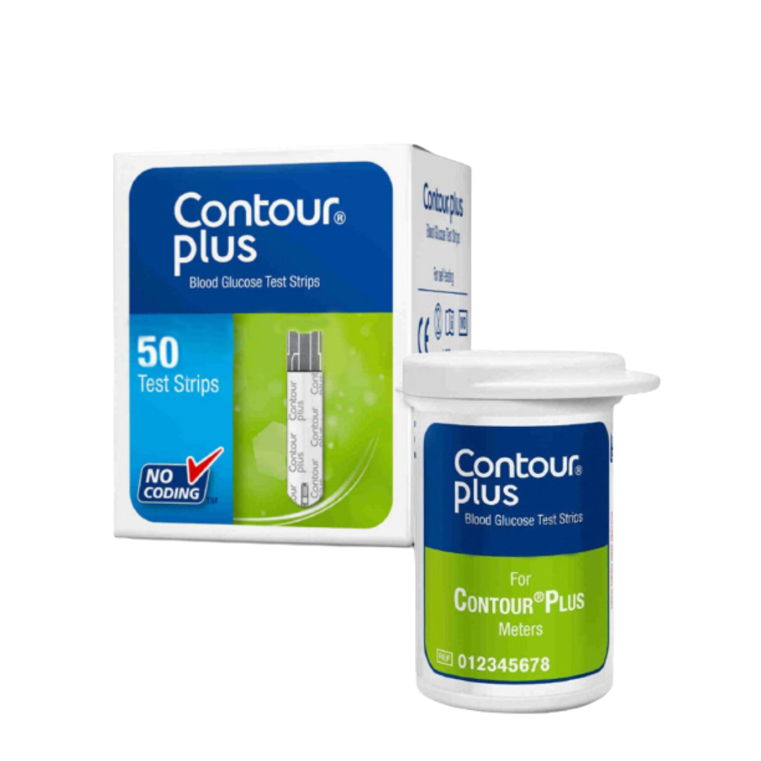- Que thử đường huyết CONTOUR PLUS (2 hộp, mỗi hộp 50 que): Que thử dùng để lấy mẫu máu từ đầu ngón tay.